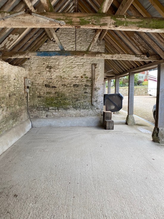 Although it is a covered space, The Byre Space is open to the elements - designs and materials should take account of this. The space is 6m(L) x 4m(W) x 2m35cm (height to the beam). It looks like this: